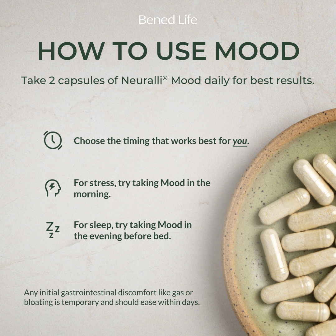 Neuralli® Mood is intended to be used daily, two capsules per serving, with or without food. For stress, try taking it in the morning. For sleep, try taking it in the evening before bed. You may find that a different time of day or different frequency works better for you.